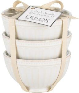 This set of three mini durable ceramic stoneware bowls features rustic grooves along the sides, and a pattern of tea-stained beads on the outside border, for a touch of the French countryside in every home. Jeff