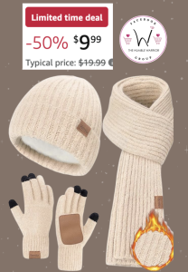 Stay warm and cozy all winter with this 3-piece knit hat, scarf, and touchscreen gloves set! Lined with soft fleece, it’s perfect for chilly days, holiday outings, or gifting to anyone who loves comfort and style. Great for men, women, and teens alike. ![]()