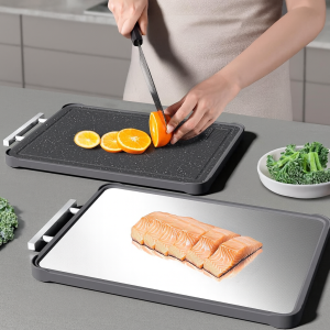 🔪🖤 This Kikcoin double-sided cutting board is both sleek and practical! One side is stainless steel for meats and the other is wheat straw for veggies — easy to clean and built to last. 🖤🔪 xo, MaryJo
