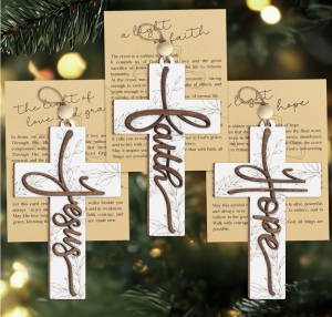 Add a touch of faith to your holiday décor with this 3-pack of Christian Cross Ornaments — featuring Faith, Hope & Jesus designs.