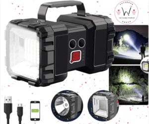 AlpsWolf Rechargeable Flashlight is amazing to have to be prepared for power outages or camping! This has 3 brightness modes, is waterproof & can charge your devices too