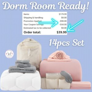 14 piece set includes 1 mattress protector (39″ x 80″), 1 fitted sheet (39″ x 80″), 1 comforter (68″ x 88″), 1 flat sheet (66″ x 100″), 2 pillow shams (20″ x 26″ + 2″), 2 pillowcases (20″ x 30″), 1 bath towel (27″ x 54″), 1 face towel (16″ x 28″), 1 hand towel (13″ x 13″), 1 bedside caddy (7.5″ x 12″), 1 laundry bag (22″ x 29″), and 1 eye mask (3.5″ x 8″). XOXO, Vicci