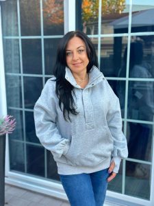 This Bellcoco sweatshirt is my favorite!! Super comfy, great quality with 3/4 zip up/snap stand collar, kangaroo pocket and thumb holes. I’m wearing grey in size small with oversized fit. Highly recommend it! There are other great color choices. XO, Alla