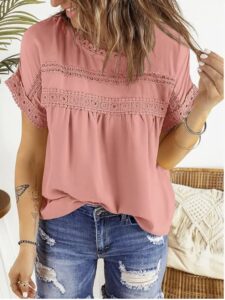 This Caracilia Women’s Lace Top is the ultimate blend of elegance and effortless summer charm! With its delicate crochet lace sleeves and flattering babydoll silhouette, this top is both feminine and breezy, perfect for warm-weather days