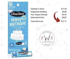 How perfect! The Chapstick Party Favor Happy Birthday Lip Balm Gift Pack has a 25% digital coupon today! Be sure you Subscribe & Save to drop the price. Cancel once it arrives without penalty. Great for goody bags and party favors!