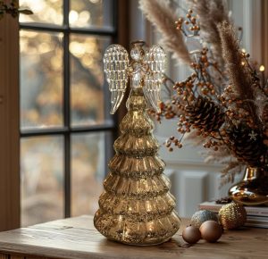 gold glass angel. It lights up with a gentle twinkle or steady shine, bringing a calm, elegant touch to any space. Perfect for mantels, bedside tables, or anywhere you want a little holiday warmth and quiet beauty.