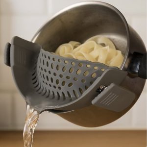 Handy little kitchen helper that clips right onto your pot or pan so you can pour and strain with no mess. Works for pasta, veggies, fruit — anything you need to drain in seconds. Silicone grip fits snug and cleans up easy. XO, Donna