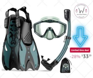 Experience the wonders of the underwater world with the KUYOU snorkel mask. Featuring a 180 degree vision shape design and anti-fog tempered glass, our mask provides crystal-clear views and an enhanced diving experience. Perfect for snorkeling, swimming, and training. Start your adventure today! The Snorkel Gear Set has a fantastic 28% off and is now $33.29. Available in dark celadon, metallic black, and metallic red. XO, Donna