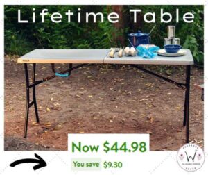 🔥Lifetime’s 5-Foot Fold-In-Half Table is a great table for game day or any outdoor adventure. Whether you are roughing it on a camping trip or out tailgating with your friends and family, this table is the site for food and drinks. This table is part of the rugged line up and features a compact fold-in-half design and handles that makes it ideal for outdoor excursions. The impact-resistant edges and corners protect the table from damage so the table maintains its look and utility. W+ members score free shipping. Everyone else at 35+  Jeff