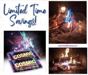 Limited Time Savings on the Magical Flames Cosmice Fire Packets! These fire color packets turn your standard campfire into something magical. Just throw one into the flames, and suddenly they’re glowing all the colors of the rainbow! Kids and maybe adults will think you’re a wizard. Perfect for evenings around the fire pit! Suitable for indoor and outdoor use. You get 12 for just $11.99. Purchase 2 and you’ll save an additional 10%. Donna