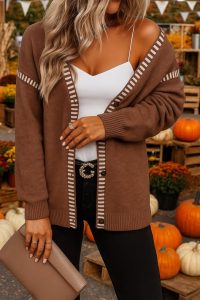 oversized cardigan wraps you up in comfort with its relaxed fit, striped trim, and button-front detail that goes with everything from jeans to leggings. Easy, effortless, and made for fall days that start chilly and end by the fire.