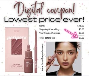 Peripera fans! If you love this Korean beauty brand, STOP! Sophie and I bought this exact kit at that gorgeous Korean beauty store in Boston. We paid full price and I’m not even mad because it’s that good. I have used it EVERY DAY and it’s STELLAR. Clip the digital coupon to score the insane price. The lip color is regularly $10 so this is an amazing value. The Rose Nude is my favorite. Highly, highly recommend. I bought another so I don’t run out!