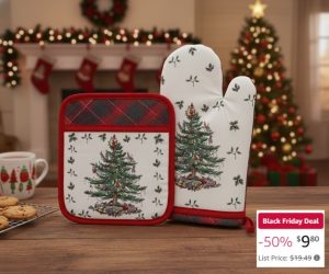 The Spode Christmas Tree Tartan Pot Holder/Oven Mitt Set by Avanti features the Christmas tree reversing to the red and green plaid. The oven mitt has a fabric loop for hanging.  Jeff