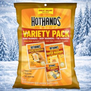 Stay warm and toasty in any cold environment with the HotHands Variety Pack! This set includes 5 pairs of hand warmers, 3 pairs of toe warmers, and 5 super warmers, providing up to 214 hours of heat in total. Jeff