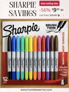 A big plunge on the Sharpie Brush Twin Permanent Markers! They have a brush and ultra fine tip. You get 12 of them. Fluid brush strokes on one end, crisp detail on the other, and colors that make everything you write feel intentional and fun. XO, Donna