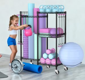 4 Tier Workout Equipment Storage Rack with Wheels and Hooks!
