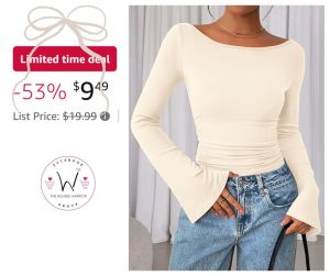 🌟🌟🌟 This top is such a score! ✨ Boat neck, bell sleeves, and that ruched fit that somehow works for jeans and nights out. It’s comfy, flattering, and one of those pieces that makes a simple outfit feel styled. Perfect for when you want casual with a little edge 💖💕 Save 53% for a Limited Time! Love, Jess