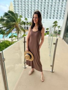 The most perfect throw on and go dress has a nice pre-season drop and a little more comes off at the final too. So easy to wear for vacation breakfast, touring the capital and every day life. The pockets sit nice and flat too. I’m including the sandals that we’re all wearing because they are so comfy and my new sun hat that is actually chic with the perfect amount of face coverage without giving me a floppy brim blind spot.