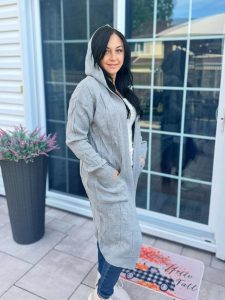 I love this hooded long cable knit cardigan with pockets! It’s super cute and cozy! Perfect piece for transitional seasons. Great for layering with a long sleeve tee or short sleeve tee. True to size. I’m wearing small. There are so many other great color choices. Save 48% at checkout. XO, Alla