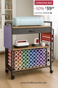 For the crafters who love staying organized — this rolling storage cart keeps everything neat, from vinyl rolls to tools and accessories. Designed to fit Cricut machines perfectly, it features 47 built-in vinyl holders, smooth-gliding wheels, and a sleek black wood-grain finish that looks beautiful in any craft room. XO, Donna