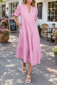 This dress is giving me all the Easter, Mom’s Day and Spring vibes. A tried and true group fave with a luxe tone on tone print, bow accent at the sleeve and pockets too. I love a flowy dress that lets me enjoy Easter brunch.